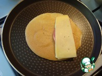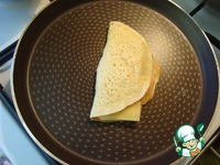 Жарим блинчики с одной стороны, переворачиваем и на 1/2 часть блина быстро выкладываем сыр с прослойкой мяса. |