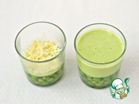 На застывший в верринах горошек выложить сыр "Бельстер Янг", залить остывшим горохово-мятным пюре. Убрать в холодильник до полного застывания. |