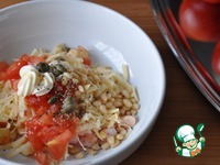 Добавляем в салат кедровые орехи, нарезанные каперсы, майонез (лучше домашний), свежемолотую смесь перцев. Перемешиваем. |