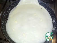 Через полчаса, как тесто настоялось, перемешиваем еще раз и начинаем жарить. Тонкие блинчики обжариваем с одной стороны. На нее будем выкладывать начинку. |