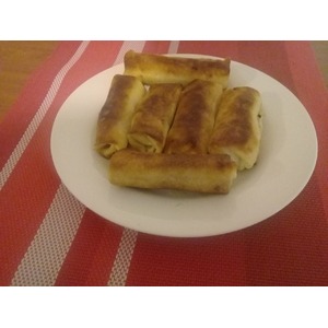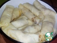 Пожарили все блинчики. Даем остыть и начинаем выкладывать начинку. Начинку выкладываем на обжаренную сторону и заворачиваем. |