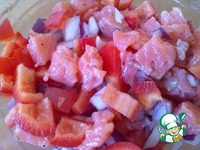 Смешать нарезанную форель с болгарским перцем и красным луком. Приправить по вкусу солью и перцем, сбрызнуть лимонным соком. Все тщательно перемешать. Накрыть пленкой и поставить в холодильник. |