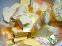 В большую миску просеять муку с солью и перемешать. Холодное масло нарезать на кубики и добавить к муке. |