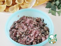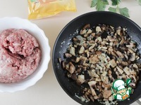 Соединить мясной фарш с обжаренным луком и грибами, посолить, поперчить, перемешать. |