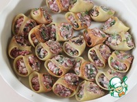 Нафаршировать макаронные изделия и уложить в форму для запекания. |
