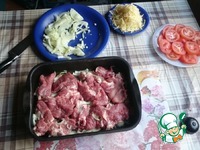 На противень с высокими краями (можно с таким же успехом в сковородку без ручки) кладем половину лука, как подушку. Сверху мясо. |