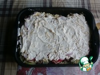 Аккуратно смазываем майонезом всю поверхность. У нас получается такая последовательность снизу-вверх: лук, мясо, лук, помидор, сыр, майонез. |