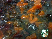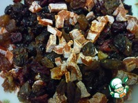 Добавить во взбитые сливки замоченные сухофрукты вместе с жидкостью, орехи, смесь специй и аккуратно деревянной ложкой или лопаткой перемешать от краев к середине - снизу вверх