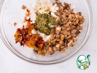 Брынзу рязмять вилкой. Добавить песто, обжаренные грибы и мелко порезанные вяленые томаты. Хорошо перемешать. |