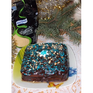 Выложить в форму, выпечь при 180 С, 30-35 минут. Готовый пирог я разрезала пополам и промазала абрикосовым джемом, сверху полила шоколадной глазурью и украсила орешками и кокосовой стружкой. |