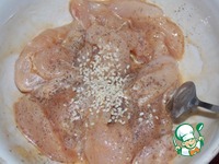 Надеть филе на шпажки, посыпать сверху кунжутом. Выложить шашлычки в смазанную маслом форму для запекания. Запечь при 180С, 15-20 минут. |