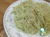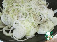 На сковороде разогреть 2 ст. л. растительного масла. Добавить лук. Посолить, поперчить, добавить щепотку сахара. Тушить на слабом огне, примерно 10 минут. |