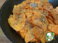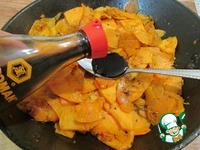 В эту же сковороду влить 2 ст. л. растительного масла. Выложить тыкву, добавить соль, черный свежемолотый перец, перец кайен и сахар. |