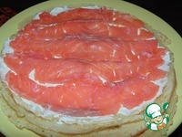Рыбу тонко порезать и выложить на блин с сыром. |
