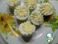 Яйца разрезать напополам (можно сделать это фигурно), желтки размыть вилкой. |