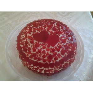 Обмазать вверх и бока кремом. Украсить, желе для украшения хорошо застыло его можно мелко порезать кубиком, я формочкой вырезала сердечки |