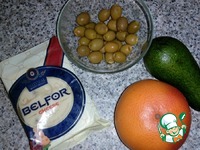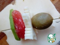 Собрать ингредиенты на шпажку: оливка - снежинка из сыра - грейпфрут - авокадо. А все вместе получается очень неожиданно, сочно и свежо. |