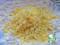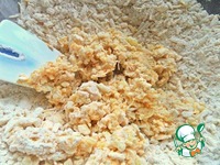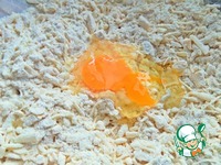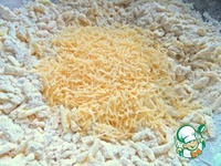 Всыпать половину тёртого сыра в тесто-крошку. |