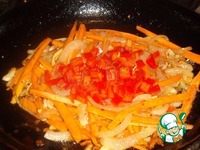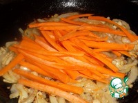 Туда же добавляем морковь, резаную тонкими полосками (как для плова), обжариваем минут 7… |
