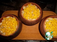Горшочки загружаем слоями: - зажарка, - грудинка, - кинза рубленая, - соль, специи, - фасоль, - кукуруза. В каждый горшочек вливаем по 50…70 мл жидкости, оставшейся от варки фасоли. |