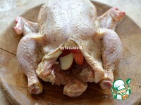 Курицу вымыть, отделить лишний жир с брюха; Втереть в курицу специи со всех сторон и подсолить; В брюшко вложить жирок и дольки яблока; |