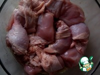 Сперва подготовим курицу: разделаем ее на порционные куски, промоем, просушим, добавим соль, перец, специи по вкусу |