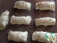 Противень смазать водой, уложить рогалики, смазать верх желтком и дать 5 минут постоять. Можно посыпать кунжутом. |