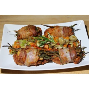 4. Заворачиваем индейку в бекон с яблоком и розмарином и запекаем в духовке 20 минут при 200С