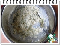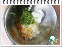 В миску отправляем творожный сыр типа "Альмете", тертый полутвердый сыр типа "Российского", яйцо, измельченную зелень (у меня - укроп), кашицу из чеснока и соль. |