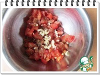 Отправляем нарезанные помидоры в миску, добавляем соль, перец, измельченный чеснок, сухие травы и растительное масло. Перемешиваем. |