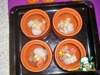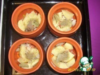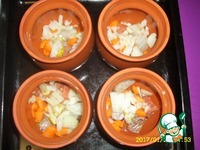 Выкладываем морковь и лук поверх рыбы в горшочки. |