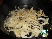 Извлекаем остатки колбасы и загружаем лук, резаный полукольцами. Обжариваем до "стекла"... |