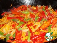 Выкладываем помидоры, перец и фасоль. Перемешиваем, обжариваем около 5 минут. Добавляем около 150 мл бульона и тушим на малом огне примерно минут 15, периодически перемешивая... |
