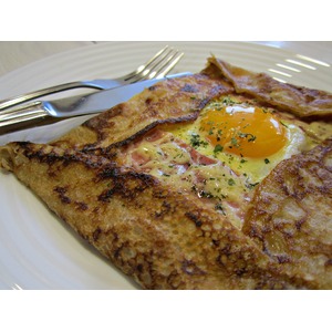 Описание: Рецепт "полной" бретонской галеты. Галеты традиционно подаются сложенными в прямоугольник, внутрь которого вкладывают различные начинки: грибы, рыбу, мясо, сыр, яйца, луковый конфитюр, шпинат и т. д. Наиболее популярным блюдом является галета с начинкой из сыра, ветчины и яичницы (омлета или глазуньи), называемая "полной". Едят их ножом и вилкой.