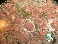 Бульон или воду довести до кипения, положить фрикадельки, 1 луковицу целиком, не очищая её. |