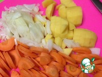 Лук и морковь нарезать полукольцами, картофель кубиком. Добавить в кастрюлю вместе с лаврушкой. |