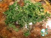 Когда крупа будет готова, вытащить из супа корни, луковицу, добавить порезанную зелень с чесноком, довести до кипения и выключить огонь. Дать супу настояться под крышкой 15-20 минут. |
