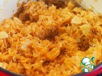 На капусту сложить мясо, накрыть кастрюлю крышкой и тушить до готовности. Время зависит от капусты и степени прожарки мяса, но обычно не занимает более 10-15 минут. |