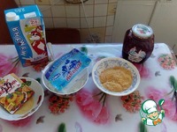 Первый шаг, творог смешать с молоком, и добавляем в нашу массу заранее приготовленный желатин, смешиваем всё, и делим пополам на две одинаковых массы, одну массу оставляем молочную, а во вторую добавляем варенье ( у меня клубничное, но вы можете любое какое вам нравится). |