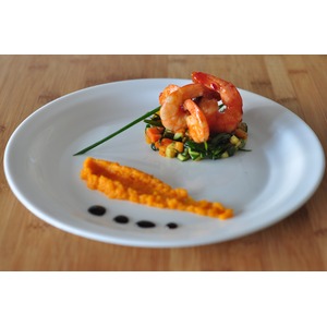 Обжаренные овощи смешать с эстрагоном. Разогреть кунжутное масло, обжарить креветки, добавить чили соус (можете приготовить сами или купить готовый). Морковь взбить в блендере в однородное пюре (по желанию можно добавить соль и сливки). На тарелку выложить морковное пюре, обжаренные овощи, креветки, украсить шнитт-луком и бальзамиком.