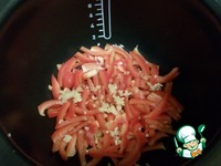 У меня мультиварка новая с кучей программ, поэтому я сначала выставила режим жарка/овощи на 7 минут. На подсолнечном масле жарим нарезанный полосками перец с выдавленным через пресс чесноком. |