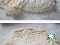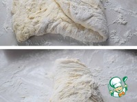 Выкладываем тесто при помощи скребка на подпыленный мукой стол и, скребком, растягиваем тесто в пласт (толщиной примерно 1-1,5 см). |