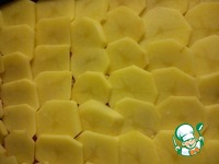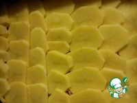 Картофель нарезать кружочками и выложить половину поверх фарша, немного посолить. |