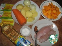 Подготовить ингредиенты: лук, морковь и картофель почистить. Рафинированное растительное масло. Лавровый лист, соль, красный згучий перец. Филе курицы и тыкву кусочками. |