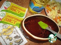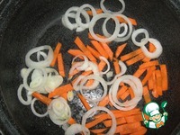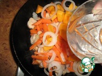 Высыпать к мясу овощи, долить 0,5 стакана воды. |