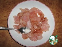 Мясо курицы порезать, присолить, поперчить красным жгучим перцем, добавить немного сахара для вкуса мяса. Перемешать. |