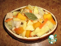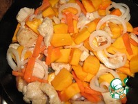 Описание: Тыква с любым мясом очень вкусна. Она придает блюду насыщенный оригинальный сладковатый вкусовой оттенок. Мясо перчила красным острым молотым перцем: на мой взгляд, красный перец хорошо сочетается с курицей и тыквой. В керамическую форму для запекания можно закладывать и сырые ингредиенты, но мне нравится корочка, поэтому я сначала чуть прижарила мясо до появления корочки (полуготовности), затем всыпала тыкву с морковью и луком. Тыква в результате также обрела корочку. Овощи с мясом стали мягкими – теперь можно и довести до готовности, добавив сырой картофель, в духовке (минут 30-40). Нежное, но сытное, ароматное, в меру острое блюдо красивого желто – оранжевого цвета – горячее солнце в тарелке.