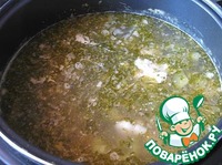 Довести рассольник до кипения, проварить 2-3 минуты, добавить нарезанную зелень и снять с огня. При подаче можно добавить чёрный молотый перец и сметану. |
