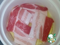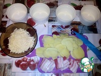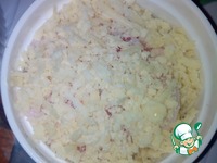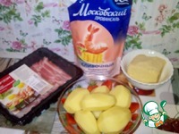 Третий слой - снова картофель. Четвёртый - бекон. Посыпаем тёртым сыром. |