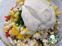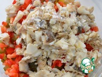 Остывшую рыбу вилкой разомните на небольшие кусочки, сложите все нарезанные ингредиенты в салатник |